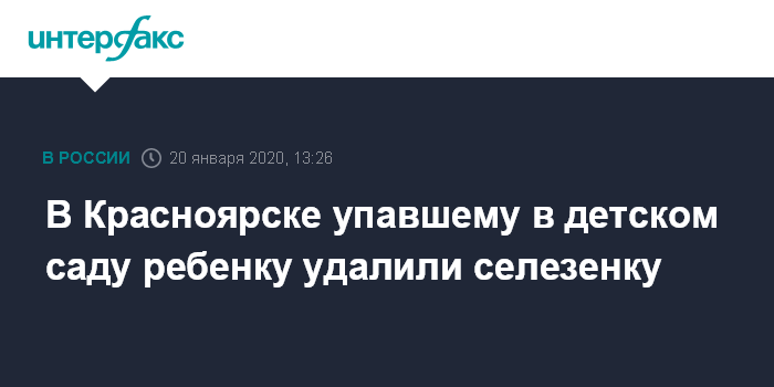 Москва. 20 января. INTERFAX.RU - Врачи 20-й больницы в Красноярске крае удалили селезенку четырехлетней девочке, получившей травму внутренних органов после падения в детском саду, сообщили агентству "Интерфаксу" в пресс-службе медучреждения.