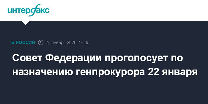 Москва. 20 января. INTERFAX.RU - Совет Федерации 22 января рассмотрит вопрос о назначении нового генпрокурора, сообщила спикер палаты Валентина Матвиенко.