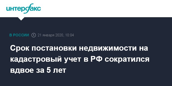 Москва. 21 января. INTERFAX.RU - Средний срок постановки объектов недвижимости на кадастровый учет в России в 2019 году составил четыре дня, что в 2,5 раза меньше показателя 2014 года (10 дней), сообщили во вторник в пресс-службе Федеральной кадастровой палаты.