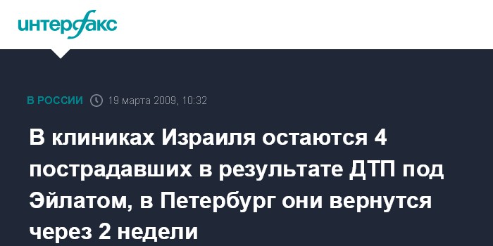 Москва. 19 марта. INTERFAX.RU - В клиниках Израиля остаются 4 человека, пострадавших в результате аварии автобуса под Эйлатом 16 декабря 2008 года, сообщает пресс-служба Российского союза туриндустрии в четверг.
