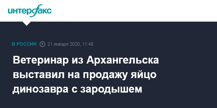 Москва. 21 января. INTERFAX.RU - Житель Архангельска в начале января выставил на Avito окаменелое яйцо динозавра с зародышем. За него он хочет 770 777 рублей.
