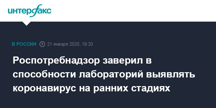 Москва. 21 января. INTERFAX.RU - В Роспотребнадзоре заверили, что у всех лабораторий Центров гигиены и эпидемиологии есть возможности для раннего выявления нового опасного коронавируса из КНР, унесшего жизни уже нескольких человек.