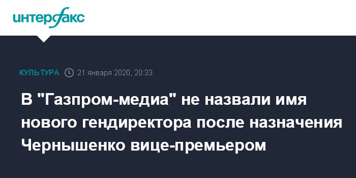 Москва. 21 января. INTERFAX.RU - В пресс-службе холдинга "Газпром-медиа" (ГПМ) оставили без комментария вопрос о том, кто возглавит холдинг в связи с назначением его гендиректора Дмитрия Чернышенко на пост вице-премьера.