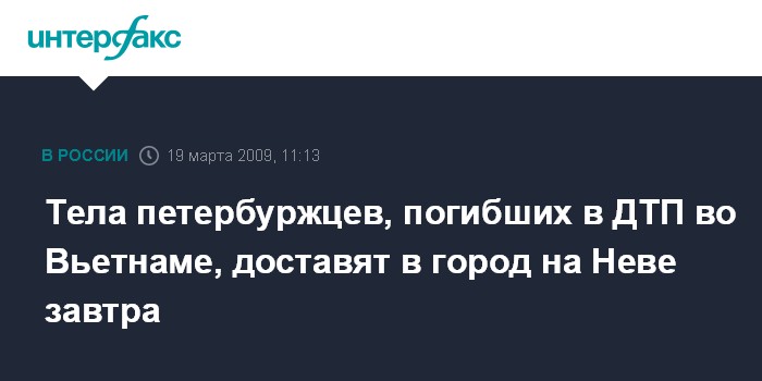 Москва. 19 марта. INTERFAX.RU - Тела двоих петербурженок, погибших в автокатастрофе под Хошимином, доставят в Петербург в пятницу. "Тела петербуржцев, погибших в аварии, доставят домой завтра", - сообщил "Интерфаксу" глава городского комитета по социальной политике Александр Ржаненков.