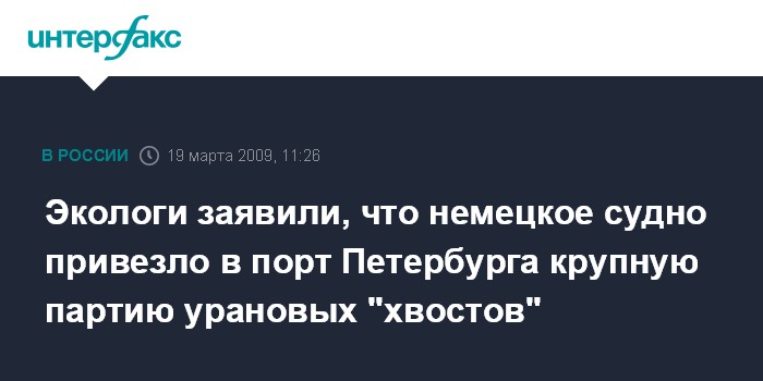 "Cудно с отходами уранового завода в Гронау прибыло в порт Санкт-Петербурга. Согласно техническим требованиям, цистерны с урановыми "хвостами" сразу после прибытия должны быть перегружены для дальнейшей транспортировки и покинуть территорию порта. Через жилые районы Петербурга груз проследует на предприятие "Изотоп" в поселке Капитолово Ленинградской области. После этого груз отправят в Сибирь на одно из предприятий, перерабатывающих радиоактивные отходы", - говорится в сообщении петербургского отделения "Гринпис".
