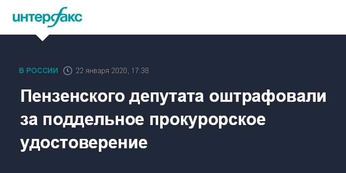 Москва. 22 января. INTERFAX.RU - Суд в Пензе назначил судебный штраф в 40 000 рублей депутату областного заксобрания, которого привлекли к уголовной ответственности за то, что он предъявил полицейским поддельное удостоверение сотрудника Генпрокуратуры. Об этом сообщило областное управление СКР. Ранее сообщалось, что это Владимир Вдонин.