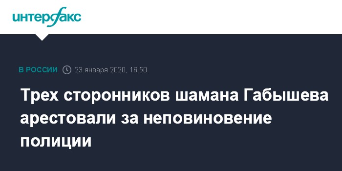 Москва. 23 января. INTERFAX.RU - Якутский городской суд арестовал на трое суток сторонников шамана Александра Габышева - Павла Богачева, Алексея Брылева и Юрия Конюхова. Их признали виновными в неповиновении законному требованию полицейских (статья 19.3 КоАП), сообщила адвокат Ольга Тимофеева.