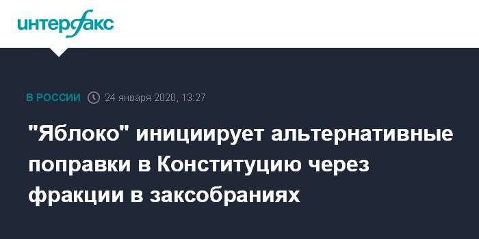 Москва. 24 января. INTERFAX.RU - Партия "Яблоко" намерена предложить свой альтернативный проект поправок в Конституцию РФ через свои фракции в заксобраниях, рассказал журналистам основатель партии Григорий Явлинский, отвечая на вопрос "Интерфакса".