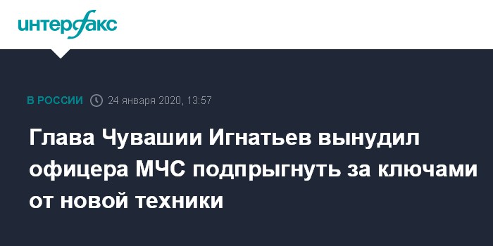 Москва. 24 января. INTERFAX.RU - Пресс-секретарь главы Чувашии Олег Сидоров назвал "дружеской пикировкой" ситуацию, когда глава Чувашии Михаил Игнатьев на вручении работнику МЧС ключей от нового пожарного автомобиля высоко поднял руку. Из-за этого сотруднику МЧС пришлось подпрыгнуть, чтобы взять их.