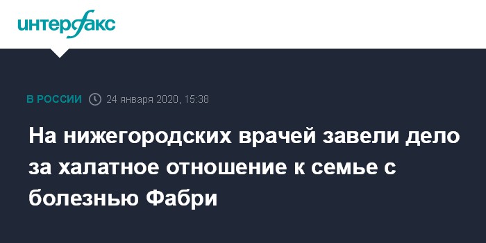 Региональные СМИ сообщали, что в лечении нуждается семья, у семи членов которой диагностировали редкую генетическую болезнь Фабри, связанную с нарушением обмена веществ. Замгубернатора Нижегородской области Андрей Гнеушев отчитался, что семью оперативно подключили к лечению, а также что по сложившейся ситуации началась служебная проверка. НТВ отмечал, что семье начали помогать после того, как в январе умер 52-летний мужчина - самый старший из родственников, страдающих этим заболеванием.