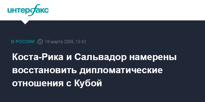 Москва. 19 марта. INTERFAX.RU - Власти Сальвадора и Коста-Рики заявили о готовности восстановить дипломатические связи с Кубой, разорванные с приходом к власти на острове Фиделя Кастро, сообщает британская телерадиокорпорация BBC. "Больше нет смысла продолжать официальный конфликт, когда мы установили каналы взаимодействия в различных сферах", - заявил президент Коста-Рики Оскар Ариас, добавив, что "мы должны быть способны приспособиться к новым реалиям". Заявление Ариаса означает кардинальное изменение отношения руководства Коста-Рики к кубинским властям, сообщает BBC.