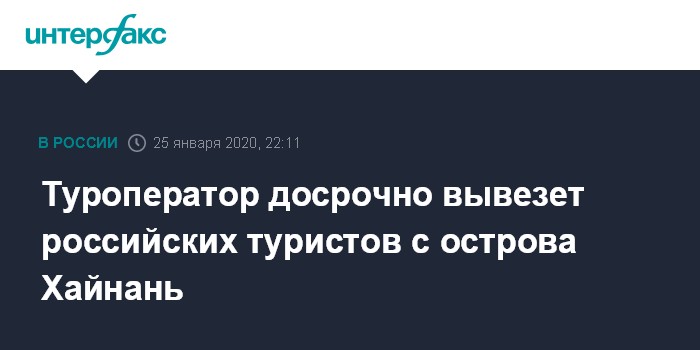 "Администрация правительства острова Хайнань запретила проводить любые экскурсии и массовые мероприятия на неопределенный срок. В связи с этим компания приняла решение о досрочном вывозе своих туристов из Китая. Эвакуация начнется с 26 января. Рейс из Хабаровска вылетит на Хайнань пустым и вывезет первую группу туристов", - говорится в сообщении.