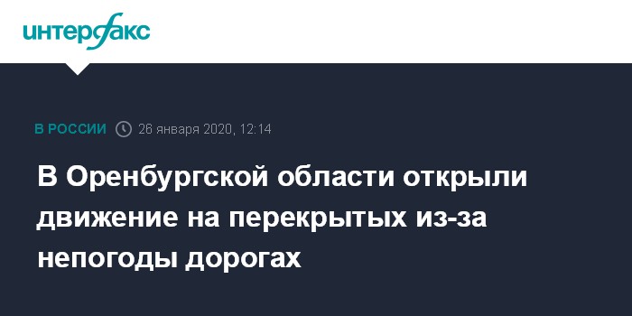Москва. 26 января. INTERFAX.RU - Восстановлено движение на нескольких участках автодорог в Оренбургской области, которые закрыли накануне из-за ухудшения метеоусловий, сообщается в воскресенье на сайте регионального главка МЧС.