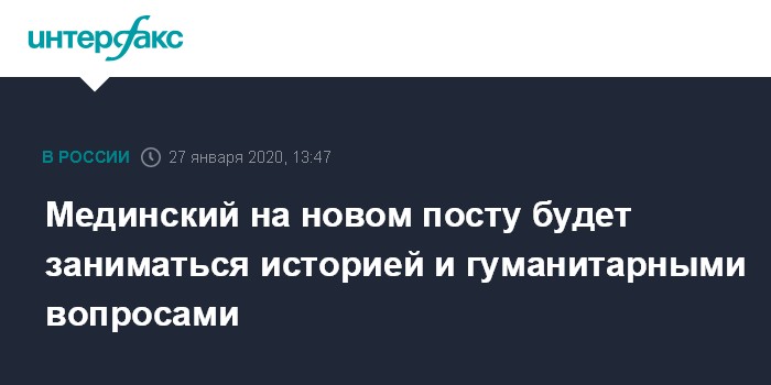 24 января стало известно, что Мединский был назначен помощником президента РФ. На посту министра культуры РФ его сменила глава департамента кинематографии Ольга Любимова.