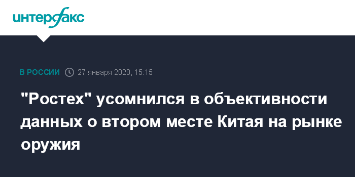 Москва. 27 января. INTERFAX.RU - В госкорпорации "Ростех" заявили, что рейтинг Стокгольмского института исследования проблем мира (SIPRI), который ставит Китай на второе место по производству оружия в мире, не является объективным.