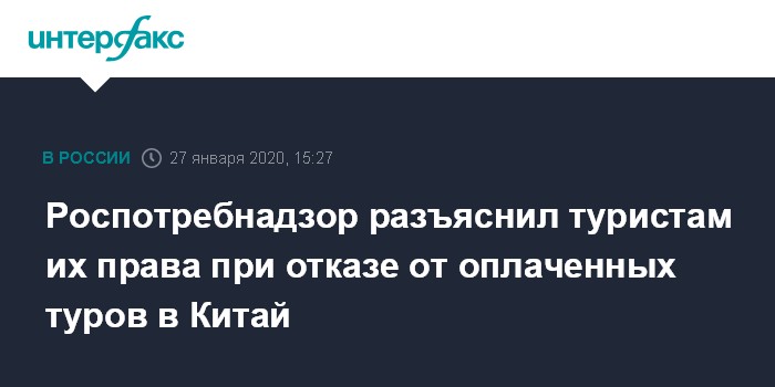 Москва. 27 января. INTERFAX.RU - Роспотребнадзор разъяснил туристам их права при отказе от оплаченных туров в КНР, где находится очаг коронавируса.