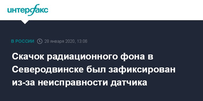 Как сообщалось со ссылкой на администрацию Северодвинска, во вторник в городе был зафиксирован скачок радиации. "Датчик сработал в "зеленой зоне", то есть в пределах нормы - от 0,2 до 0,4 микрозивертов в час. Было зафиксировано 0,3 микрозиверта. Превышения фона как такового не было сильного", - сказал собеседник агентства.