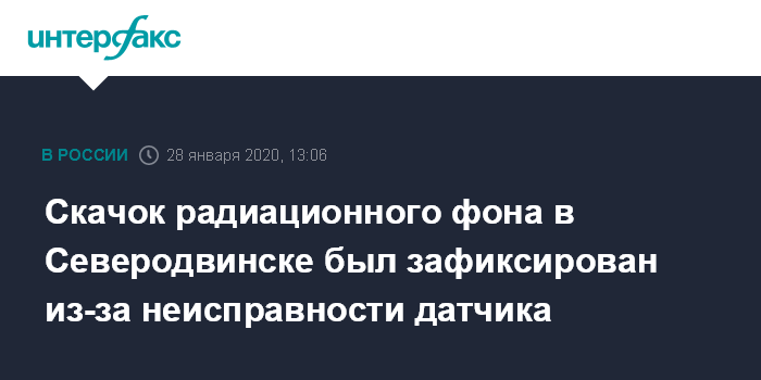 Москва. 28 января. INTERFAX.RU - Изменение радиационного фона в Северодвинске Архангельской области было зафиксировано во вторник в результате неисправности датчика, сообщил журналистам начальник отдела гражданской защиты администрации города Валентин Магомедов.
