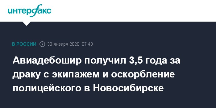 Москва. 30 января. INTERFAX.RU - Обской городской суд Новосибирской области приговорил к 3,5 годам колонии строгого режима пассажира рейса Новосибирск-Москва за грубое нарушение общественного порядка, публичное оскорбление сотрудника транспортной полиции и нанесение побоев командиру воздушного судна, сообщает в четверг Западно-Сибирское СУ на транспорте.