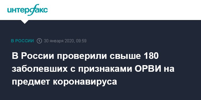 Москва. 30 января. INTERFAX.RU - Роспотребнадзор проверил 184 заболевших с признаками острых респираторных вирусных инфекций (ОРВИ), случаев заражения новым коронавирусом из КНР на территории России не зарегистрировано, сообщает пресс-служба ведомства.