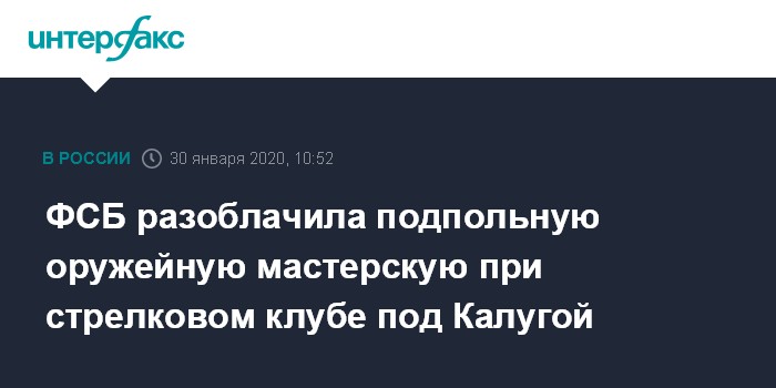 Москва. 30 января. INTERFAX.RU - ФСБ объявила, что пресекла деятельность нелегальной мастерской по переделке охотничьего и охолощенного оружия в боевое с автоматическим ведением огня, открытую при спортивно-стрелковом клубе "Паритет-СВ" в Юхнове Калужской области.