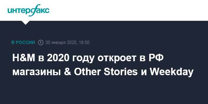 Москва. 30 января. INTERFAX.RU - Шведский ритейлер Hennes & Mauritz AB (H&M), владелец второй по величине в Европе сети магазинов одежды, планирует в 2020 году вывести в Россию два новых бренда - магазины & Other Stories и Weekday, следует из годового отчета компании.
