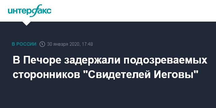 Москва. 30 января. INTERFAX.RU - В Печоре задержаны 60-летний и 43-летний жители Печоры, которых подозревают в организации или участии в деятельности организации "Свидетели Иеговы", которая считается в России экстремистской и запрещена с апреля 2017 года. В их отношении возбуждено уголовное дело, сообщили в СК по Коми.
