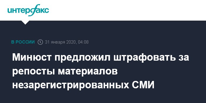 Москва. 31 января. INTERFAX.RU - Министерство юстиции РФ предложило штрафовать за распространение материалов изданий, не зарегистрированных в России в качестве СМИ (включая зарубежные), а также за их перепосты. Кроме того, предлагается ввести штрафы для СМИ за непредоставление информации о финансировании, а также снизить в десять раз штраф для юрлиц за распространение экстремистских материалов.