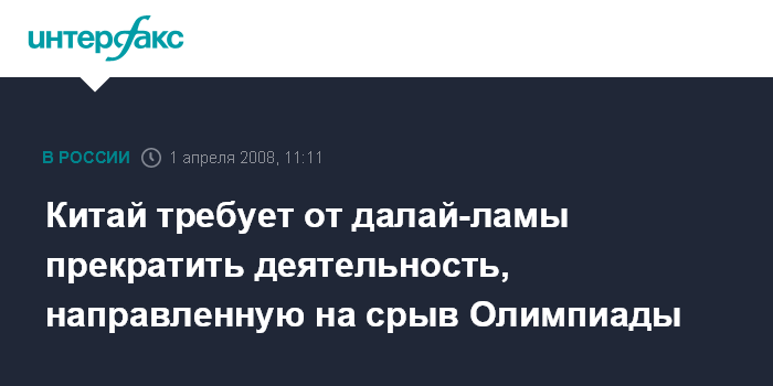 Пекин. 1 апреля. INTERFAX.RU - Китай требует от духовного лидера тибетских буддистов далай-ламы прекратить подрывную деятельность в отношении пекинской Олимпиады и призывы к отделению Тибета от родины, заявила во вторник на брифинге официальный представитель МИД КНР Цзян Юй.