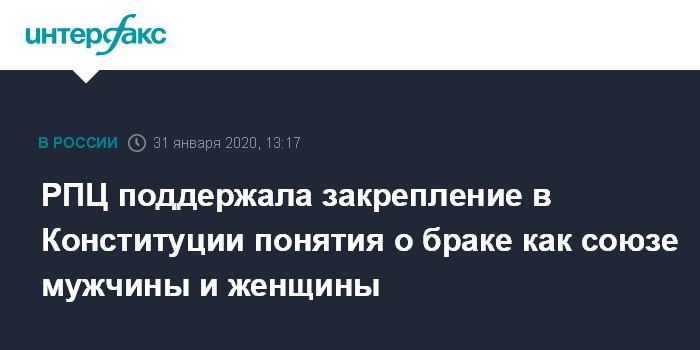 Москва. 31 января. INTERFAX.RU - Глава синодального Отдела по взаимоотношениям Церкви с обществом и СМИ Владимир Легойда поддержал предложение внести в Конституцию РФ пункт о защите традиционных семейных ценностей и закрепить понятие семьи как "союза мужчины и женщины".