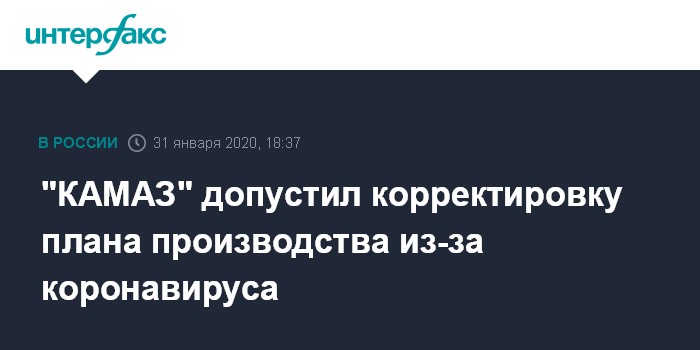 Москва. 31 января. INTERFAX.RU - ПАО "КАМАЗ" допускает возможность корректировки с марта своих производственных планов, в случае дальнейшего распространения коронавируса в Китае и в других странах-производителях комплектующих, сообщает корпоративное издание автозавода.