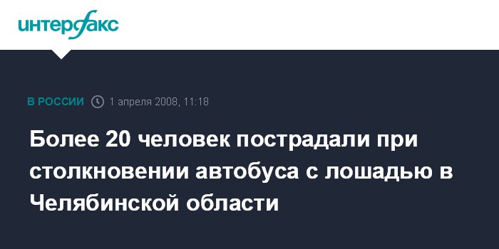 Екатеринбург. 1 апреля. INTERFAX.RU - В поселке Буранном Агаповского района Челябинской области во вторник ночью пассажирский автобус врезался в лошадь.