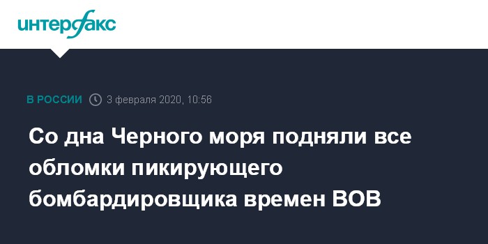 Москва. 3 февраля. INTERFAX.RU - Экипаж спасательного судна Черноморского флота (ЧФ) "Эпрон" завершил работы по подъему со дна Черного моря фрагментов пикирующего бомбардировщика Пе-2 времен Великой Отечественной войны (ВОВ), сообщил официальный представитель ЧФ Алексей Рулев.