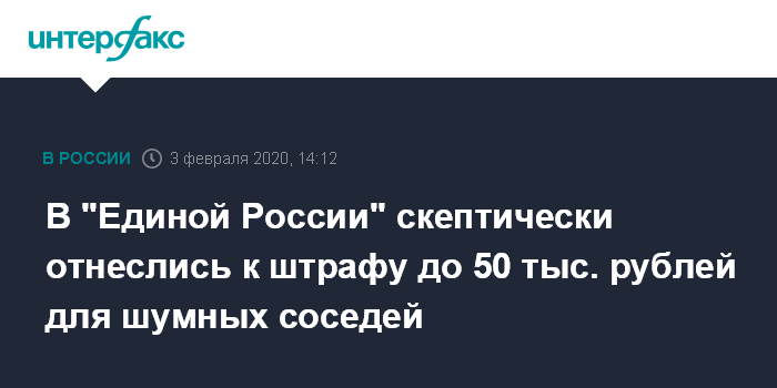 Москва. 3 февраля. INTERFAX.RU - В думской фракции "Единая Россия" не знакомы с идеей депутата Ольги Павловой о наказании за нарушение тишины в многоквартирных домах в ночное время и сомневаются в обоснованности взимания за это до 50 тысяч рублей штрафов.