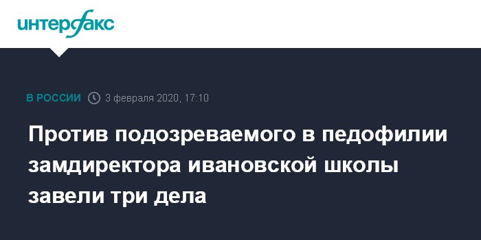 Москва. 3 февраля. INTERFAX.RU - Следственные органы в Иваново возбудили три уголовных дела в отношении заместителя директора по учебно-воспитательной работе школы №37, подозреваемого в растлении несовершеннолетних. Об этом сообщила "Интерфаксу" руководитель пресс-службы СУ СКР по региону Ирина Котова.
