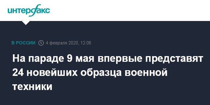 Москва. 4 февраля. INTERFAX.RU - Двадцать четыре новейших образца боевой техники впервые будут представлены на военном параде, который пройдет 9 мая в Москве, сообщил министр обороны РФ Сергей Шойгу.