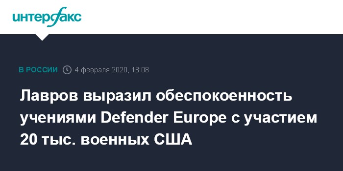 Москва. 4 февраля. INTERFAX.RU - Предстоящие учения Defender Europe 2020 с участием 20 тысяч американских военнослужащих вызывают у Москвы большую озабоченность, Россия будет реагировать на них, не создавая ненужных рисков, заявил во вторник глава российского МИД Сергей Лавров.