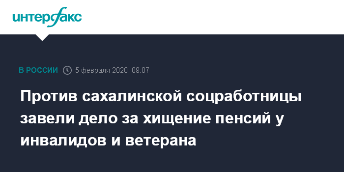 Москва. 5 февраля. INTERFAX.RU - Уголовное дело возбуждено в отношении сотрудницы областного государственного автономного учреждения "Центр медико-социальной реабилитации "Чайка", которая подозревается в хищении пенсий инвалидов, пенсионеров и ветерана Великой Отечественной войны. Об этом сообщает пресс-служба следственного управления (СУ) СКР по Сахалинской области.