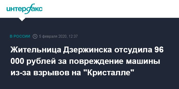 Москва. 5 февраля. INTERFAX.RU - Жительница Дзержинска через суд добилась компенсации в 96 000 рублей за то, что в результате взрывов на оборонном предприятии ГосНИИ "Кристалл" был поврежден ее автомобиль. Об этом соощила объединенная пресс-служба судов Нижегородской области.