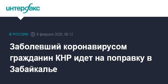 Москва. 6 февраля. INTERFAX.RU - Медики в больнице Забайкалья оценивают состояние гражданина КНР, у которого подтвердился коронавирус, как удовлетворительное, сообщили агентству "Интерфакс" в пресс-службе губернатора региона в четверг.