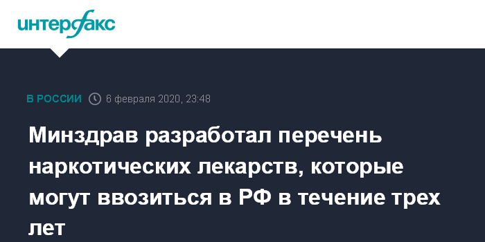 Москва. 6 февраля. INTERFAX.RU - Минздрав разработал перечень незарегистрированных психотропных и наркотических лекарств, подлежащих ввозу в РФ, который будет действовать до конца 2023 года.