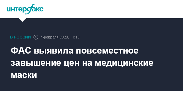 Москва. 7 февраля. INTERFAX.RU - Федеральная антимонопольная служба (ФАС) выявила повсеместное завышение цен на медицинские маски вплоть до 10-15 раз, ведомство намерено жестко наказывать за картельный сговор производителей или оптовиков, сообщил статс-секретарь - заместитель руководителя ФАС России Андрей Цариковский.