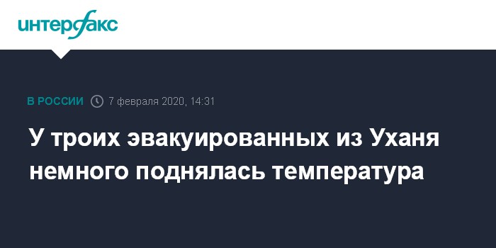 Москва. 7 февраля. INTERFAX.RU - У трех человек, эвакуированных из Уханя и помещенных на карантин в санатории "Градостроитель" под Тюменью, вечером выявили повышение температуры до 37,2 градуса. Об этом рассказал один из россиян, находящихся в "Градостроителе".