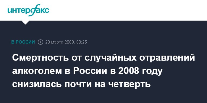 Москва. 20 марта. INTERFAX.RU - В России в 2008 году смертность от случайных отравлений алкоголем уменьшилась на 23,7%.
