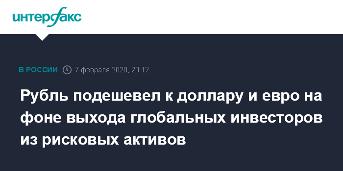 Как отмечают эксперты "Интерфакс-ЦЭА", рубль активно дешевеет к доллару и евро на вечерних торгах на фоне выхода глобальных инвесторов из рисковых активов и дешевеющей нефти. Участники рынка продолжают следить за новостями о распространении коронавируса.