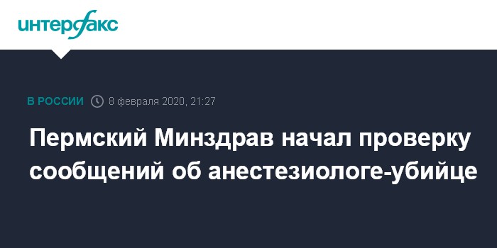 Москва. 8 февраля. INTERFAX.RU - Министерство здравоохранения Пермского края проводит служебную проверку после появившейся на форумах информации об анестезиологе, который якобы убивал ветеранов в одной из пермских больниц, сообщила министр здравоохранения Пермского края Оксана Мелехова на своей странице в инстаграме в субботу.