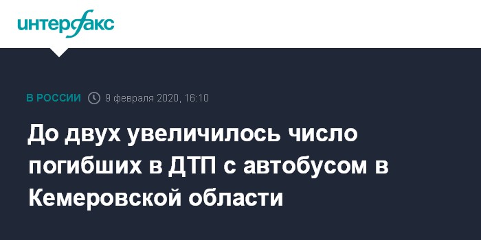 Москва. 9 февраля. INTERFAX.RU - Количество погибших в столкновении грузового автомобиля и пассажирского автобуса в Кемеровской области увеличилось до двух, сообщили "Интерфаксу" в воскресенье в пресс-службе областного центра медицины катастроф.