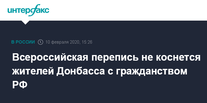 Москва. 10 февраля. INTERFAX.RU - Всероссийская перепись в 2020 году не коснется жителей Донбасса, заявил заместитель руководителя Федеральной службы государственной статистики (Росстат) Павел Смелов.