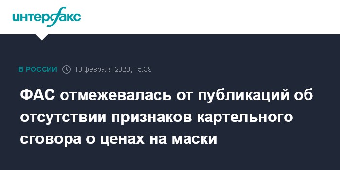 Москва. 10 февраля. INTERFAX.RU - Публикации о том, что "ФАС не видит признаков картельного сговора в завышении цен на медицинские маски", не являются официальной позицией ведомства. Об этом говорится в комментарии антимонопольной службы.