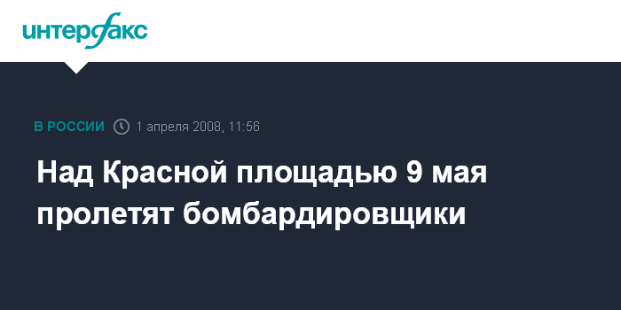Москва. 1 апреля. INTERFAX.RU - Пять стратегических бомбардировщиков пролетят над Красной площадью в Москве 9 мая в ходе Парада Победы, сообщил "Интерфаксу-АВН" во вторник помощник главкома ВВС РФ полковник Александр Дробышевский.